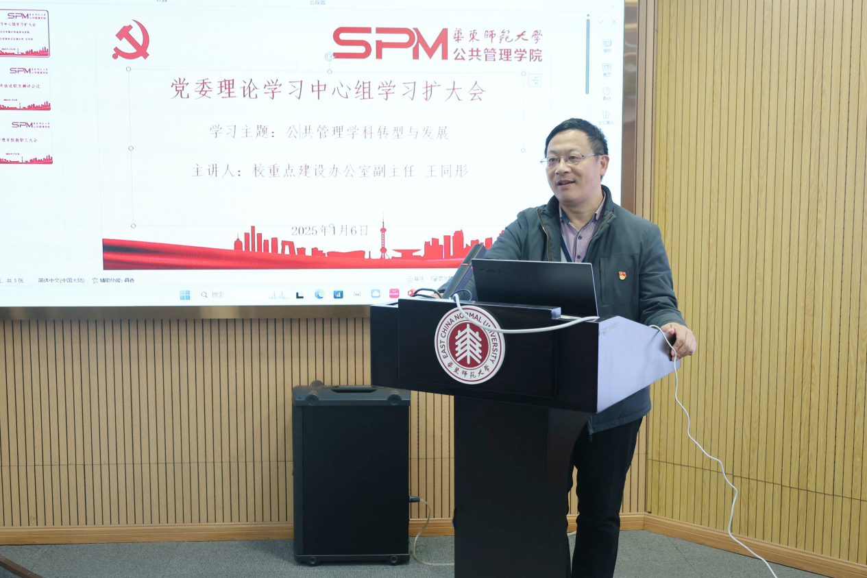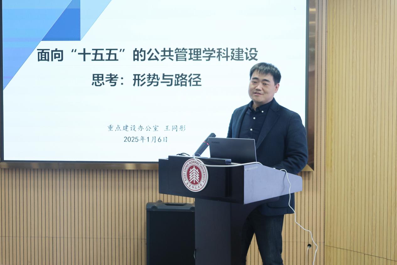 1月6日下午,51暗网 党委在普陀校区图书馆二楼报告厅举行理论学习中心组扩大会,邀请校重点建设办副主任王同彤以“面向‘十五五’的公共管理学科建设思考:形势与路径”为题做报告。学院党政班子、全体教职工参加本次集体学习扩大会,会议由51暗网 党委书记高恩新主持。