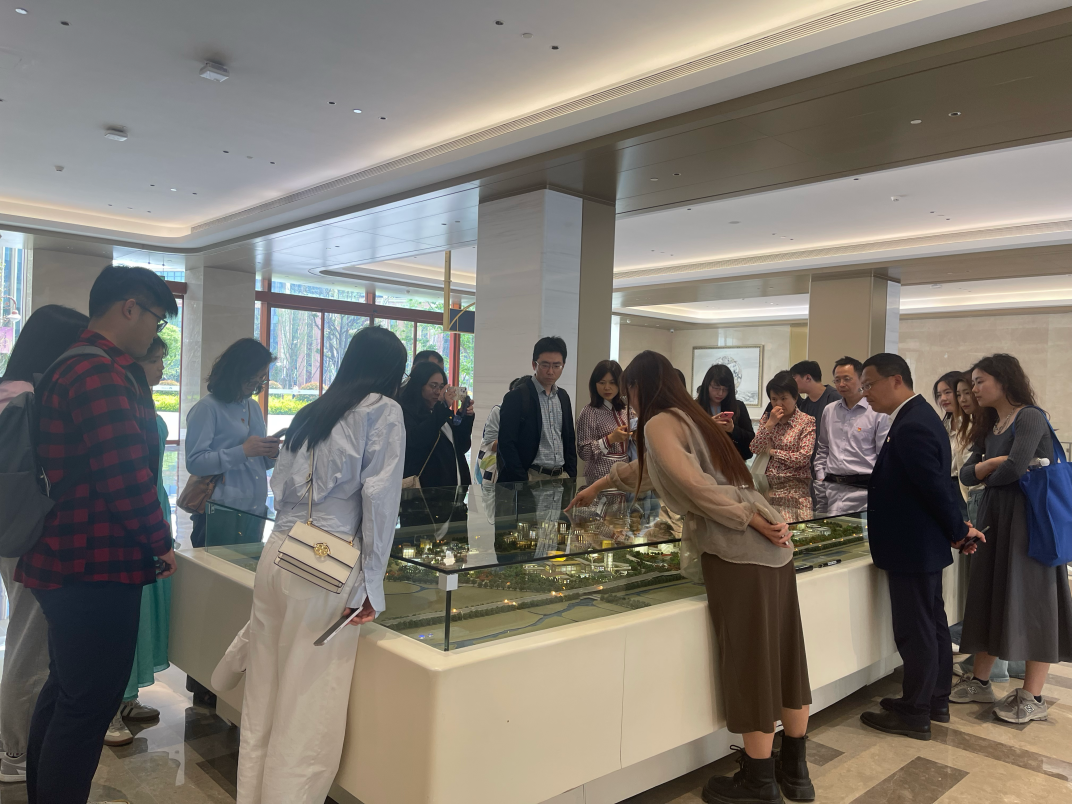 到达练秋湖研发中心后,王荔颖带领大家参观了研发中心沙盘模型,为大家详细介绍了华为研发中心的整体规划、发展理念、功能布局、空间治理等。