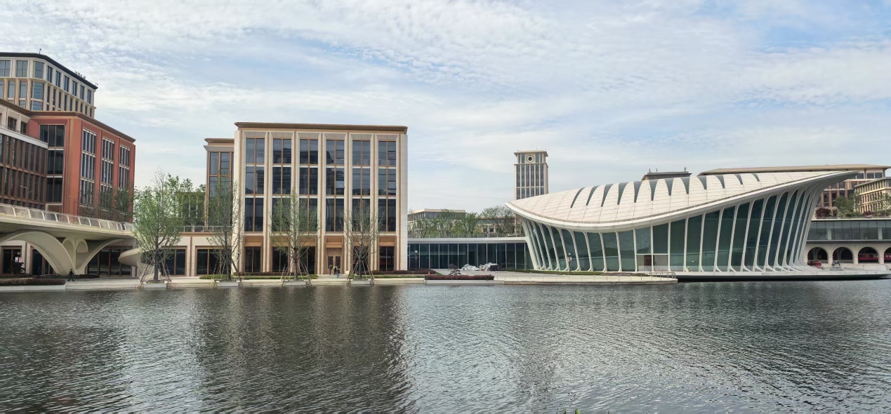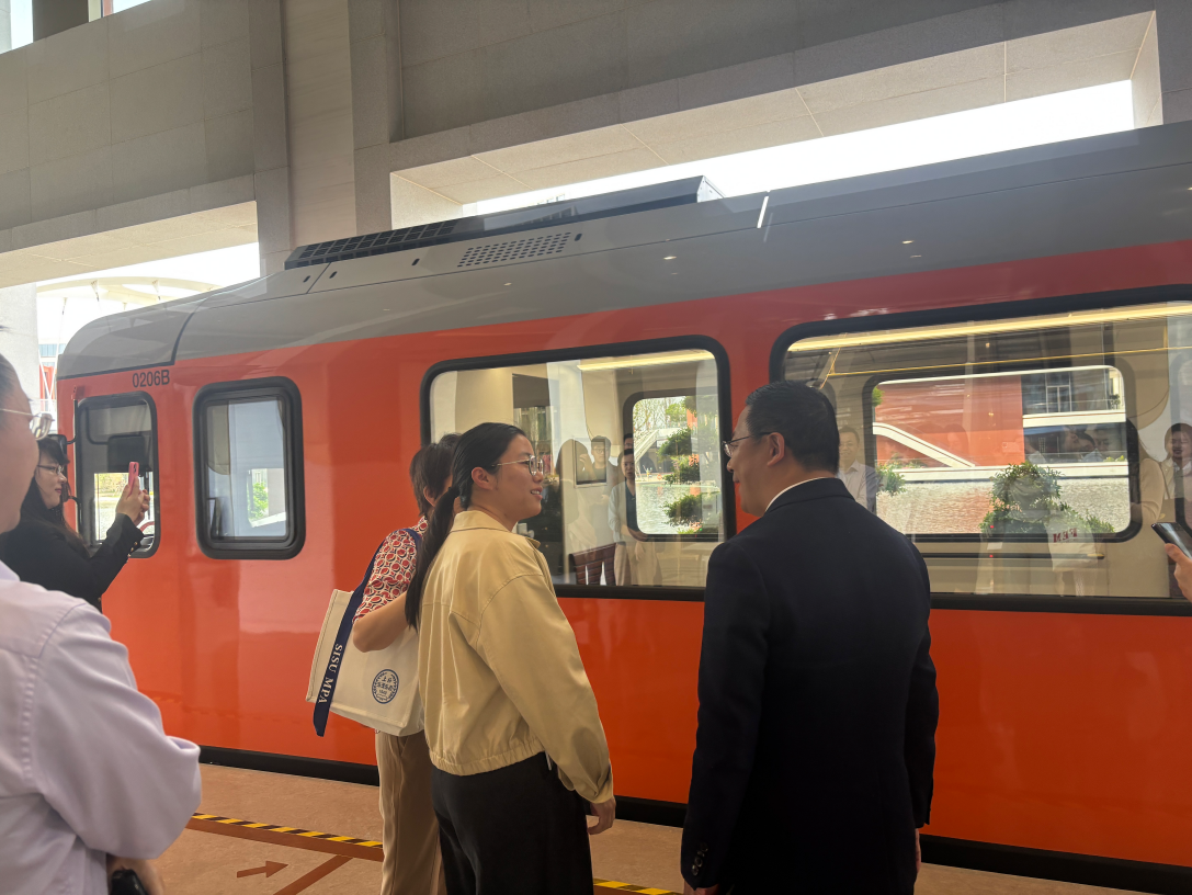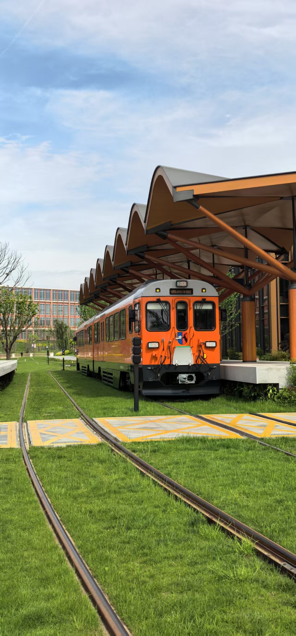 随后,师生们从C区中央站乘坐研发中心的特色小火车,一路湖光潋滟、绿意盎然,现代建筑与自然生态交融共生。