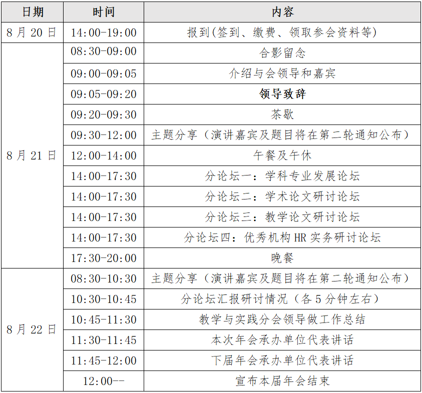 大会将邀请知名学者、知名企业HR高管发表主题演讲,邀请高校人力资源学科负责人研讨学科发展和专业建设,举办学科专业发展论坛和专业负责人联席会议、理论界和实业界对话、教学案例开发与教学方法论坛等活动。